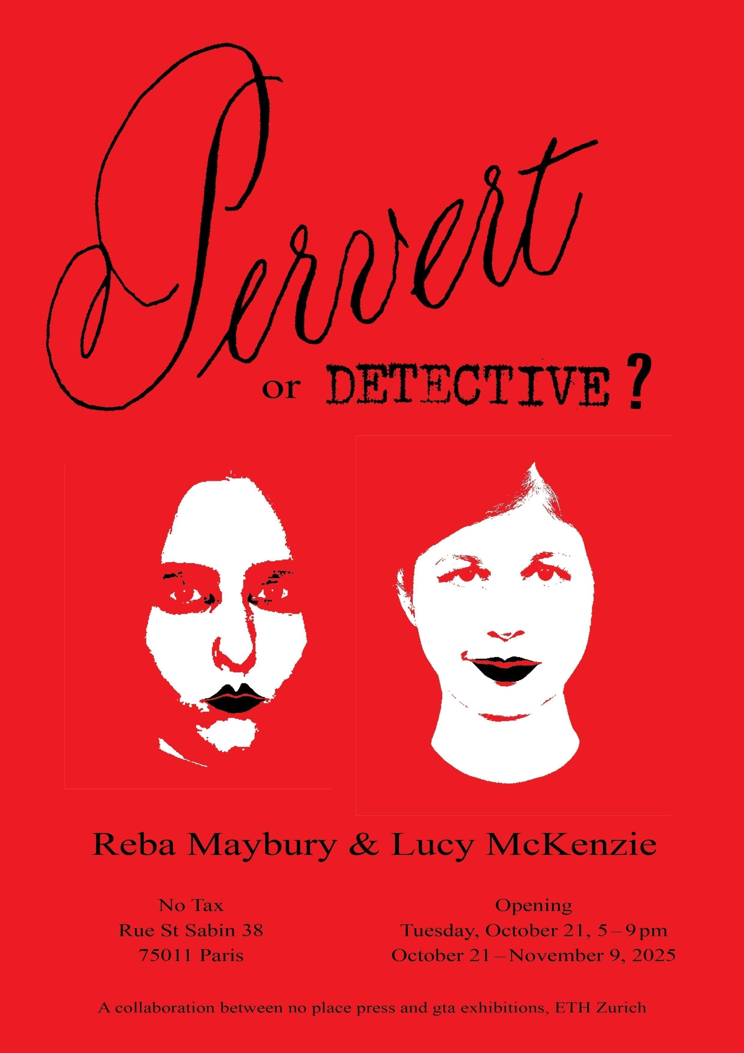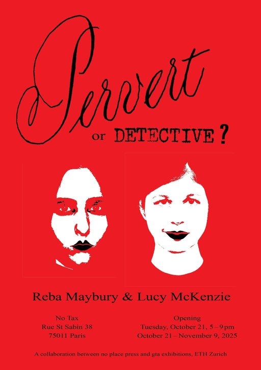 | 2 | Reba Maybury & Lucy McKenzie Pervert or Detective? book launch | Tuesday, 21 October, 5 to 9 pm | No Tax 38 Rue St Sabin 75011 Paris | ||||